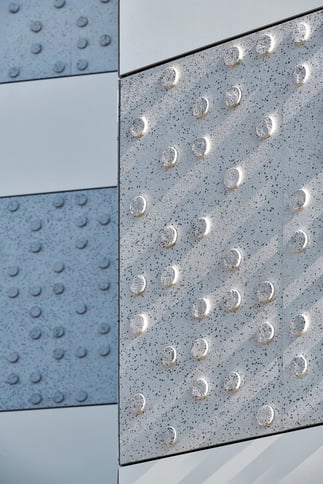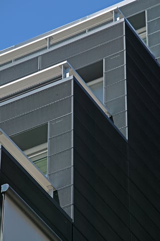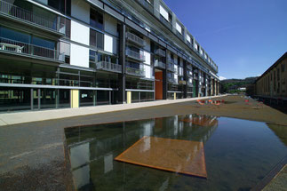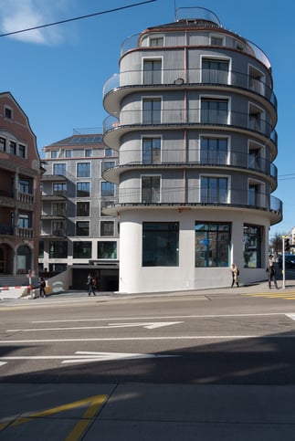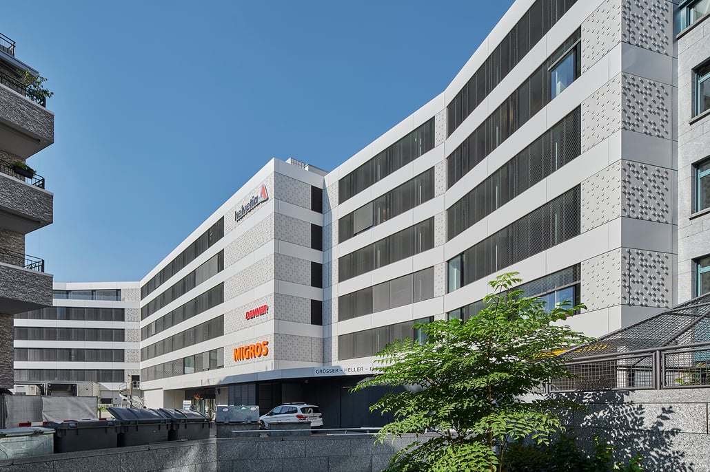 Wohn- und Gewerbehaus mit 102 Wohnungen auf dem Sulzerareal. Fassade aus eingefärbten Betonelementen